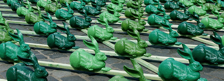 Nach langer Zeit sind die Dürer-Hasen in den Grüntönen der Original-Installation „Das große Hasenstück“ aus 2003 wieder lieferbar in maigrün, mintgrün, grasgrün und moosgrün.