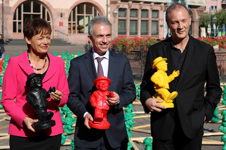 Nach den Stationen Wiesbaden, Berlin, Hofgeismar, Schwerin und Stuttgart sind die Einheitsmännchen auf ihrer Deutschlandreise nun am Ziel in Frankfurt/Main angekommen.