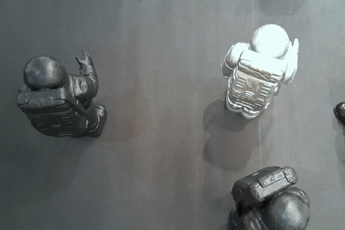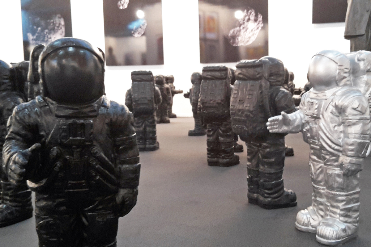 Anlässlich der 13. art KARLSRUHE stellt Ottmar Hörl das Thema Welt-Raum-Forschung in den Mittelpunkt seiner Präsentation. So wird der White Cube des Messestands zum Schauplatz einer skulpturalen Invasion und zum Ort der besonderen Begegnung: Serielle Astronauten-Wesen erobern den Raum und strecken Besuchern die Hand zur Begrüßung entgegen.