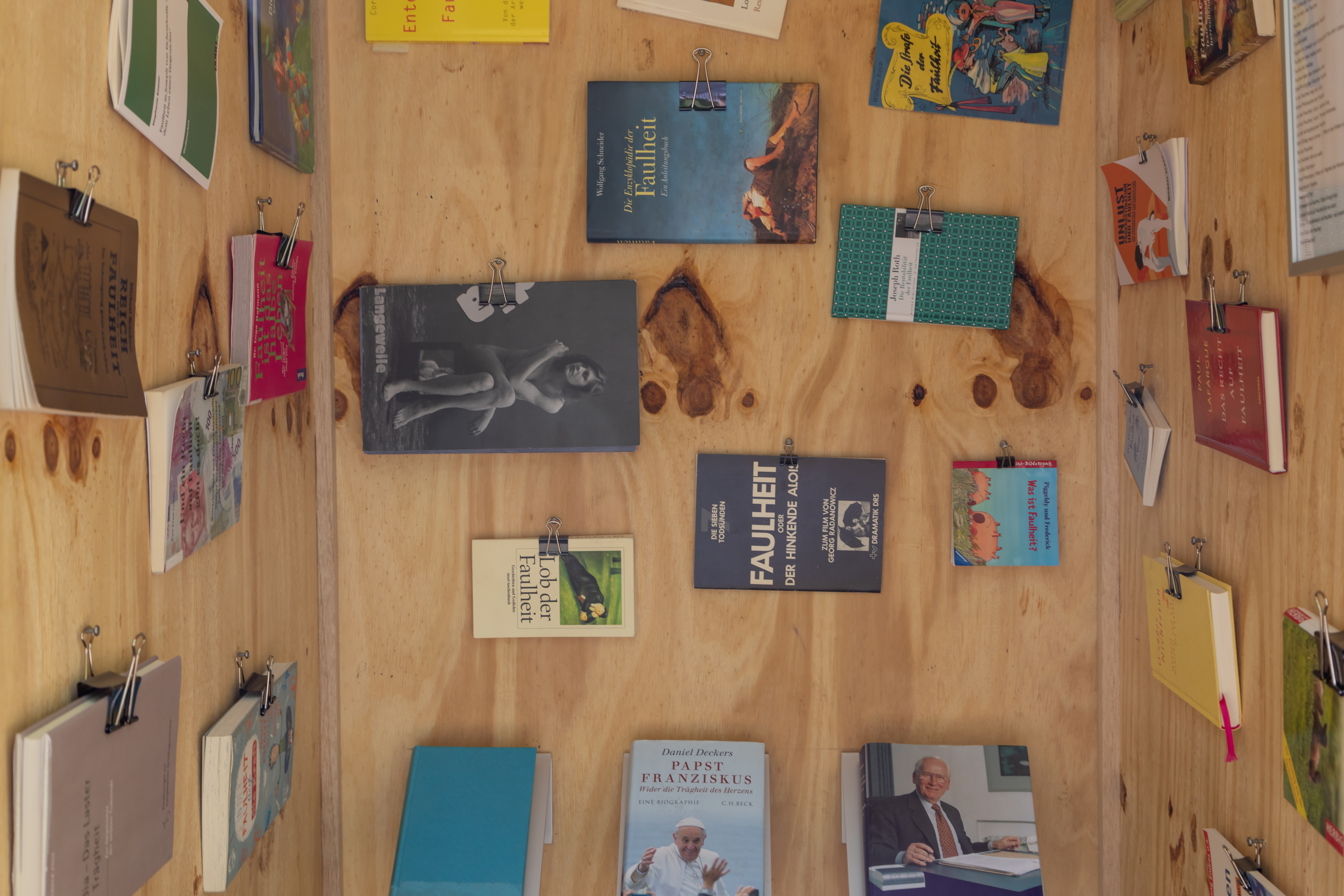 Sieben bundesweit tätige KünstlerInnen haben sich zu den sieben Todsünden Gedanken gemacht und ihre individuelle Auseinandersetzung mit einer Sünde auf jeweils einem Anhänger dargestellt. Die Aufgabe wurde per Losverfahren an die teilnehmenden Künstler übertragen, wobei Ottmar Hörl das Los der "Faulheit" zufiel. Seinem Credo entsprechend "Skulptur als Organisationsprinzip" darzustellen, gestaltet der Künstler die Faulheit mittels Büchern und Heften zum Thema, die er mit Klammern an den Holzwänden des Anhängers verteilt. Eine individuelle Eigeninterpretation oder eine stilistische Festlegung des Schaffenden sucht der Betrachter vergebens, denn der minimale Raum wird zu einer kleinen Bibliothek, die einen gigantischen, vielfältigen Gedankenraum eröffnen kann. Das Musikstück "Lob der Faulheit" des Komponisten Joseph Haydn auf einem Ghettoblaster per CD abspielbar, verweist auf ein weiteres Gebiet, das den Hörsinn miteinbezieht. Ein schlichter Stuhl lädt zum Faulsein ein.