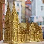 Ottmar Hörl eröffnet mit seiner neuen Installation einen Raum zwischen dem gotischen Bauwerk St. Peter und seiner Vermarktung als Andenken. Mit 150 farbigen Domplastiken aus Kunststoff, akkurat angeordnet in einem 15 Meter langen und 3 Meter hohen Regal, wird das Bauwerk ganz neu erfahrbar: Größer als gängige Souvenirs, haben die Plastikskulpturen Modellcharakter. So können die Betrachter Details der gotischen Architektur ganz anschaulich erfahren, ertasten und in Augenschein nehmen: Die Türme, Strebebögen, Fialen und Widerlager – alle Charakteristika der Gotik. Was sonst nur eine Drohne sieht, wird nun durch die Skulpturen für den Betrachter sichtbar. Durch diesen ungewöhnlichen Blickwinkel werden die Plastiken auf ganz neue Art Botschafter der Stadt Regensburg.