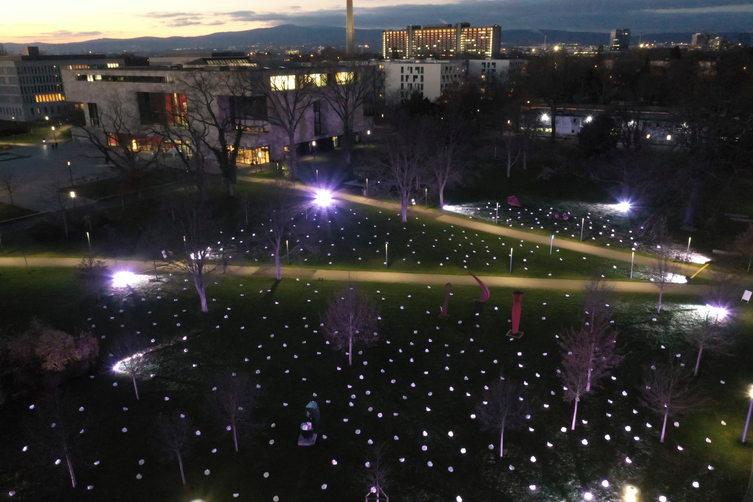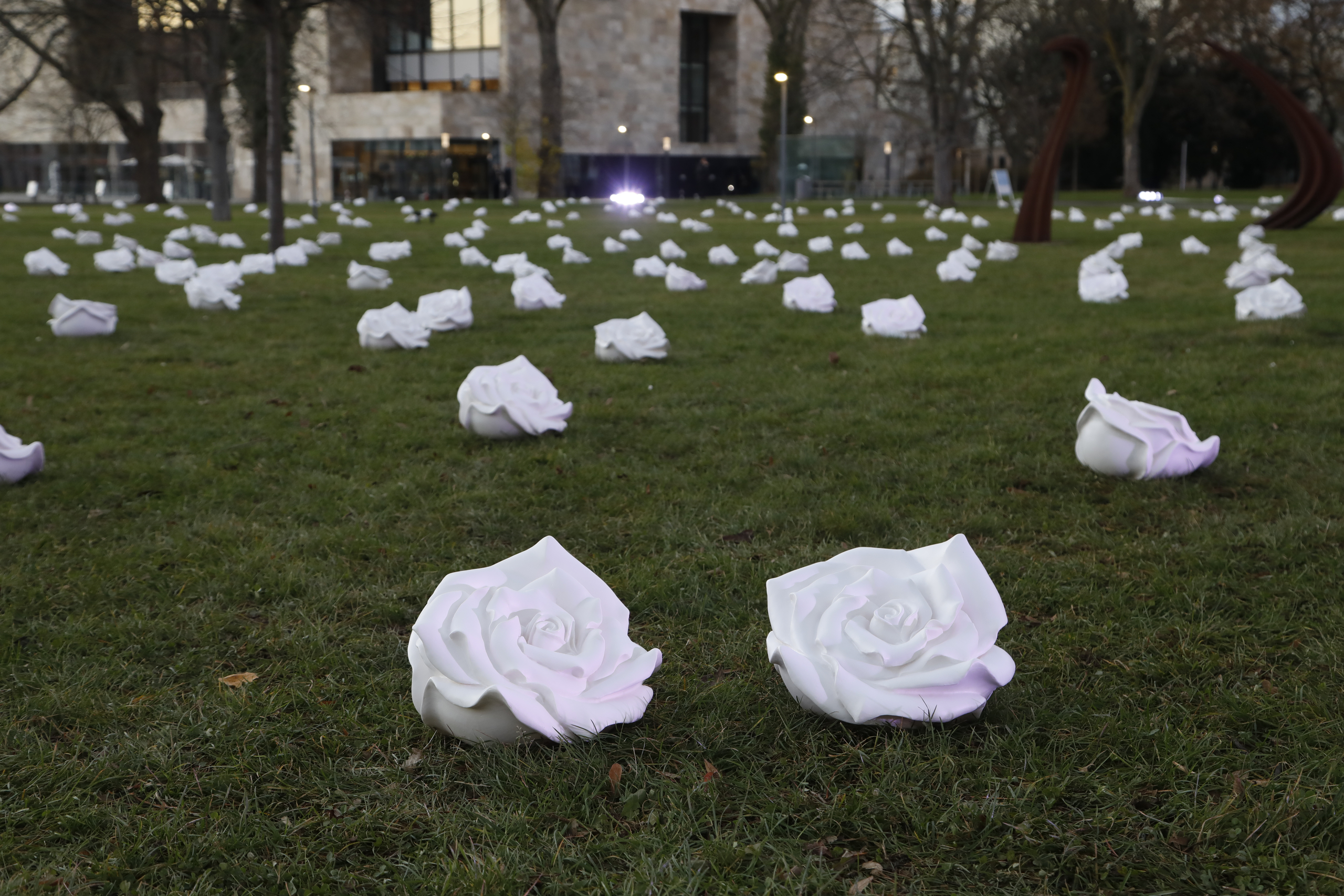 Die serielle Installation ist, zusammen mit einem deutsch-italienischen Fotoprojekt über die Pandemie, eine Würdigung der Opfer der COVID-19-Krise und der Pfleger, die Übermenschliches gaben und geben. Besonders die Bilder aus dem italienischen Bergamo im Frühjahr des letzten Jahres haben sich den Menschen tief eingeprägt. Die Installation ist vom 24. November bis zum 03. Dezember zu sehen. Bereits vor einem Jahr wurde ein Memorial aus weißen Rosen von Ottmar Hörl in der Villa Vigoni, 65 Kilometer entfernt von Bergamo, zum Gedenken eingeweiht, initiiert vom deutsch-italienischen Konsortium Goethe-Vigoni Discorsi. Dieses Memorial greift die Goethe-Universität mit ihrer jetzigen Installation auf und eröffnet zudem eine Perspektive auf die Zukunft: Denn die weißen Rosen, die alle vom Künstler handsigniert wurden, können zu Gunsten von Deutschland-Stipendien der Studierenden der Goethe-Universität erworben werden – um der anhaltenden Pandemie zum Trotz Wissenschaft und Forschung zu fördern.