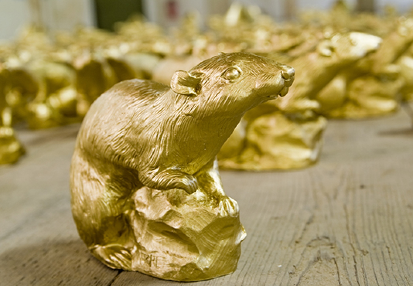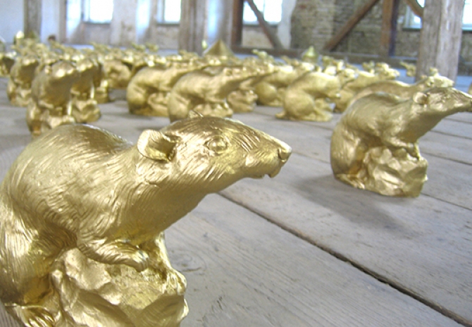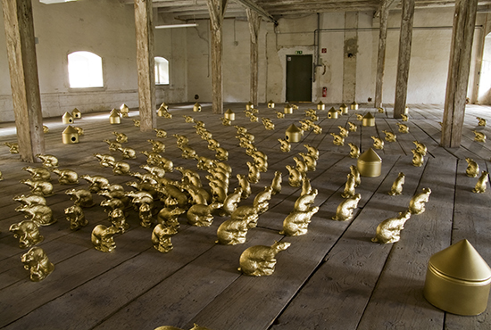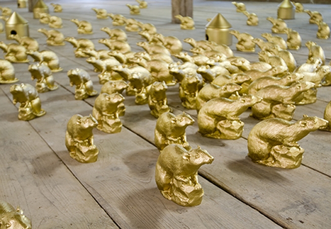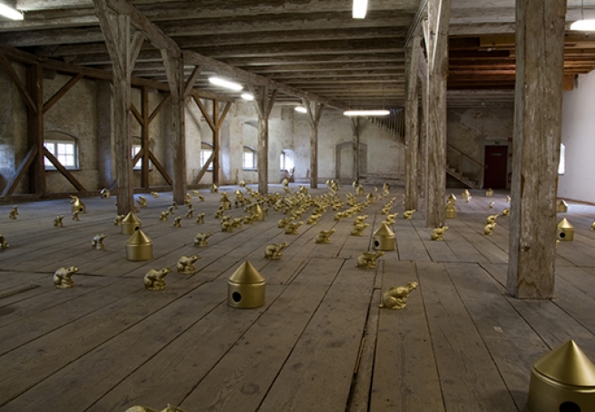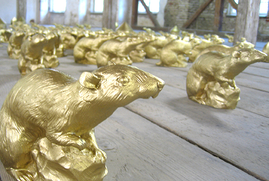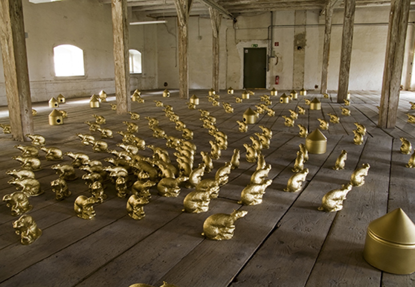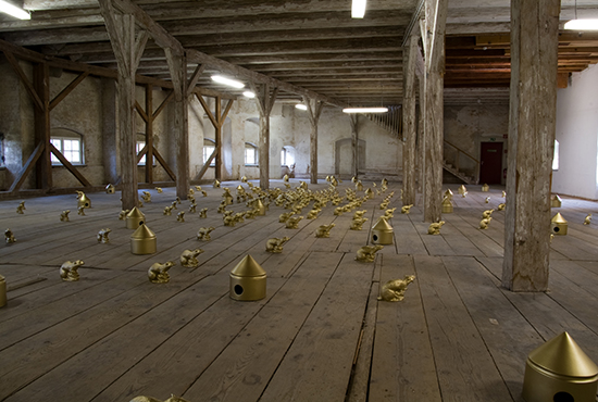 Für die Ausstellung im Dachstuhl des Bayersichen Schlossmuseums Friedberg installierte Ottmar Hörl 300 goldene „Schlossratten“ und einige goldene Ratten-Häuser über die gesamte Fläche.