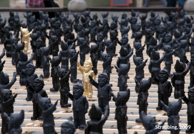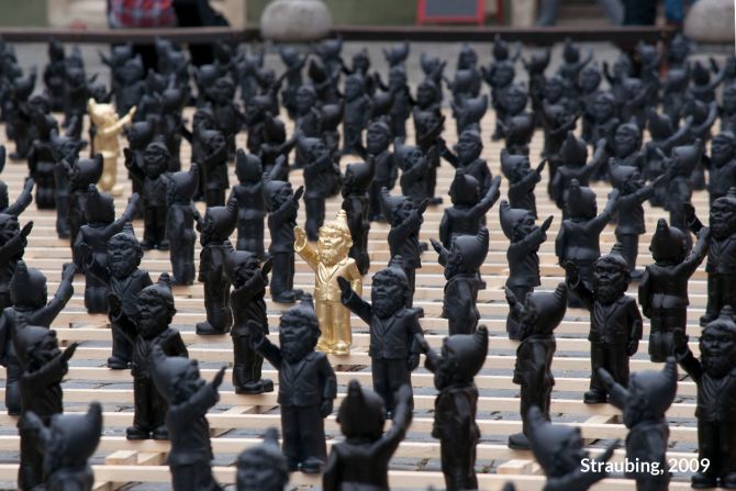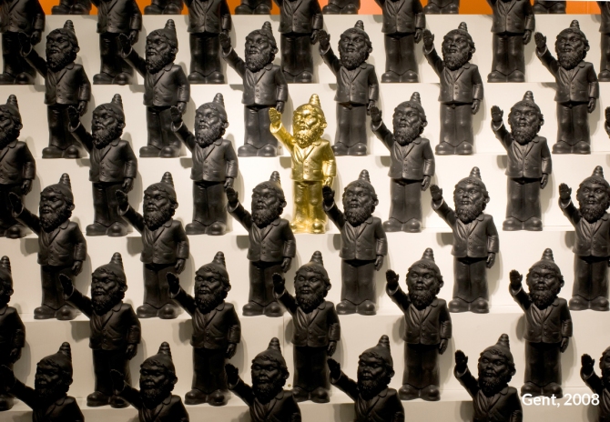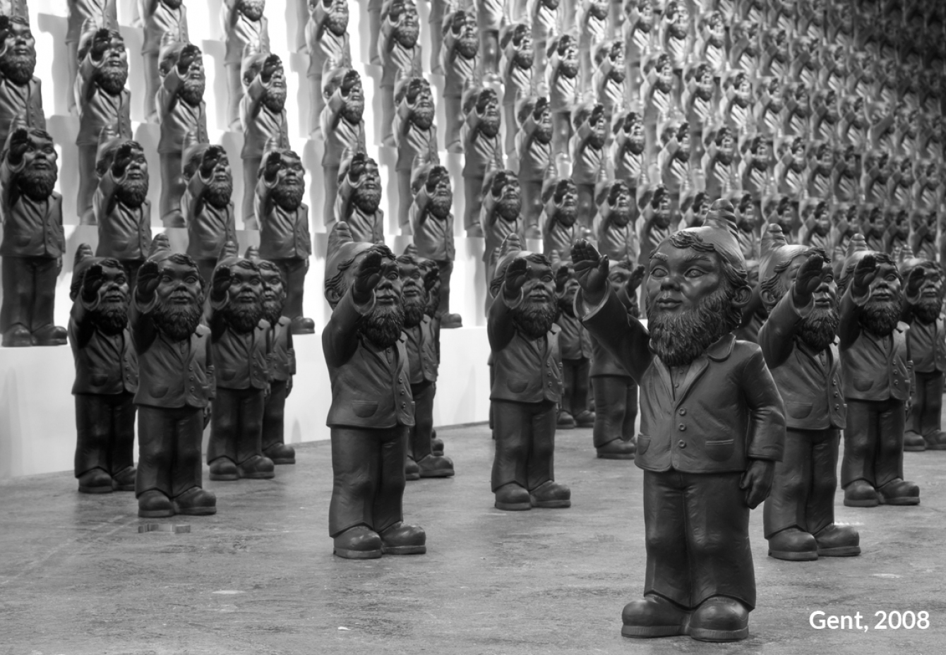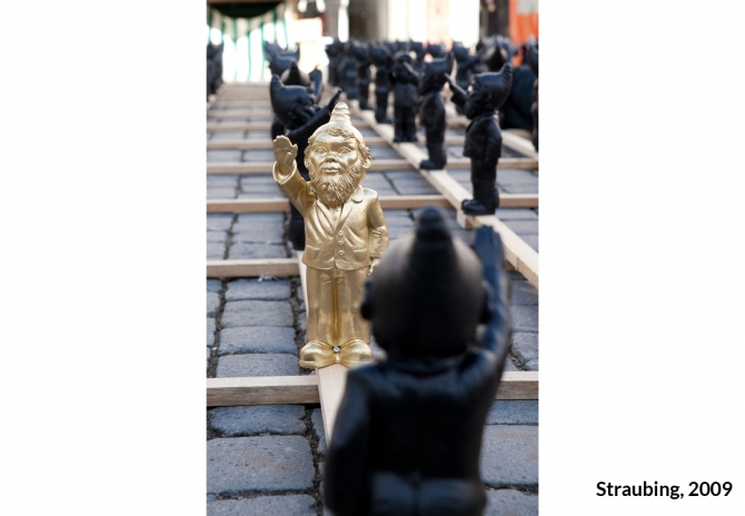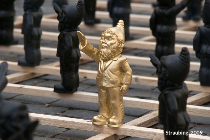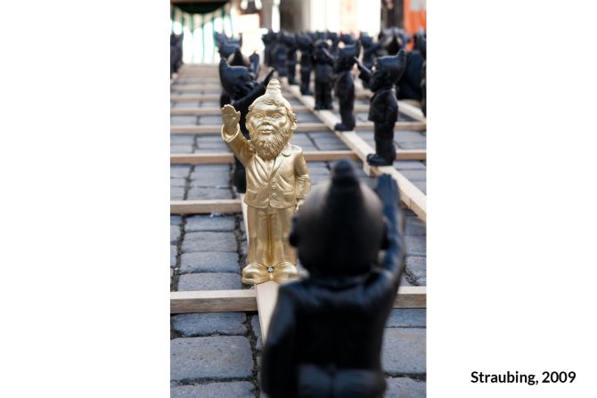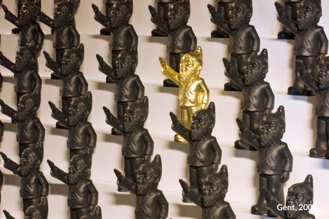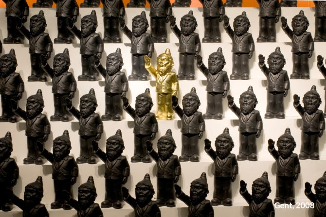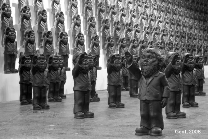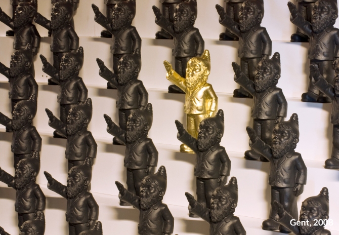 Unter dem Titel „Dance with the Devil“ entwickelte Ottmar Hörl eine Installation in Form einer „Persiflage auf das Herrenmenschentum der Nazis“. Die Aktion wurde auf der internationalen Kunstmesse Lineart in Gent/Belgien im Jahr 2008 erstmals präsentiert. Im Eingangsbereich der Messe bilden etwa 700 serielle, monochrome Skulpturen eine Armee aus Gartenzwergen, die mit regungslosem Gesichtsausdruck den rechten Arm zum Hitlergruß heben. Auf der Unterseite jeder einzelnen Figur ist die Bezeichnung „poisoned“ (vergiftet) eingraviert. Damit gelingt es Hörl, Irritation zu erzeugen, um gleichzeitig die Mechanismen und Manipulationsstrategien hierarchischer Herrschaftssysteme zu entlarven: Wie Gift wirkt, das können wir uns bildlich vorstellen. Ist die Substanz erst einmal in einen Organismus eingedrungen, schreitet der Zersetzungsprozess voran und vernebelt letztlich auch das Bewusstsein.