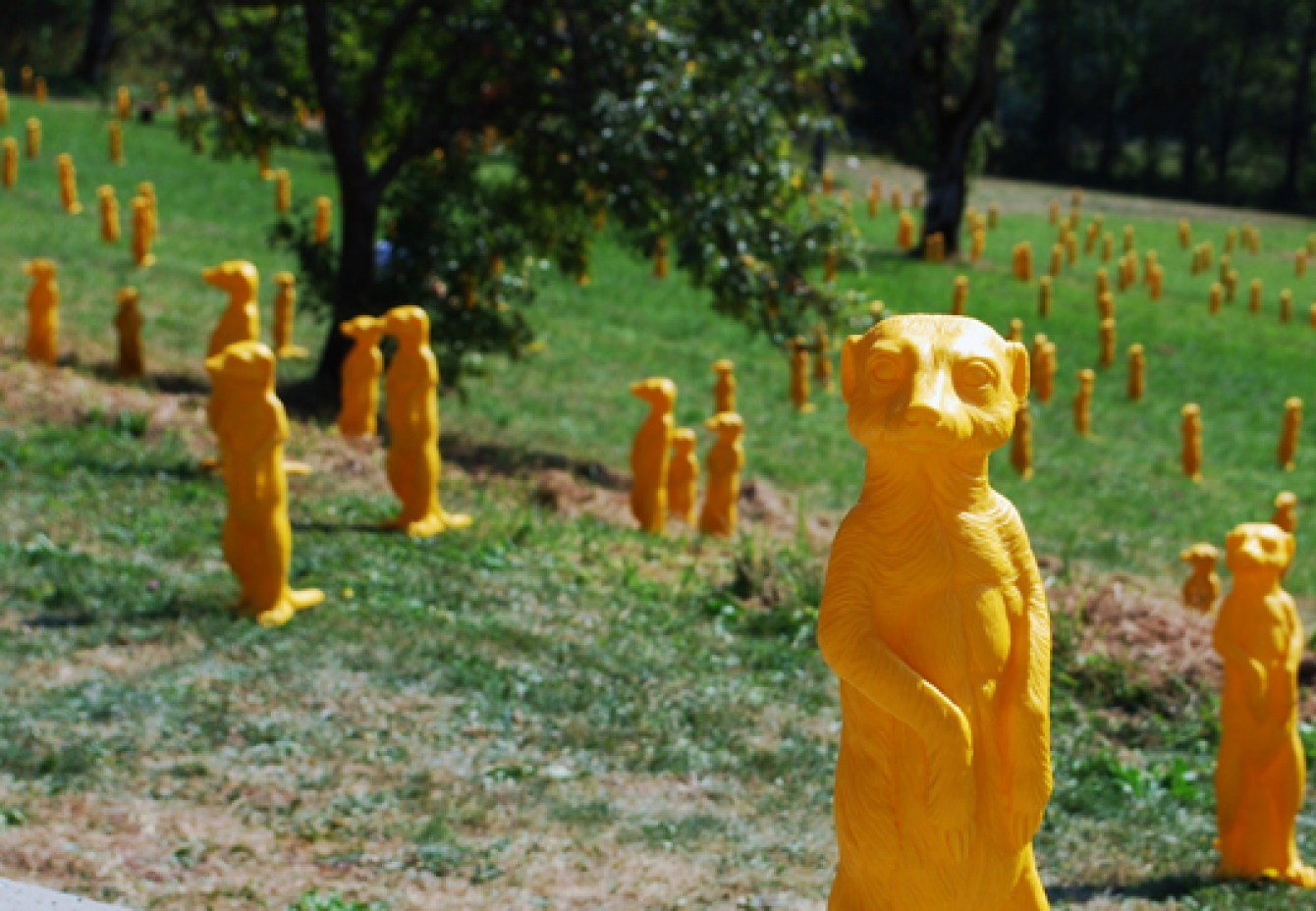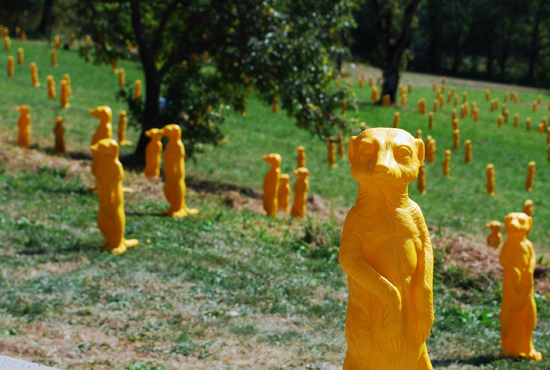 1000 Erdmännchen unternehmen einen Betriebsausflug in die Umgebung des Hofgut Hohenkarpfen. Fern ihrer Heimat im südlichen Afrika symbolisieren sie die globale Vernetzung und die Erschließung aller Winkel dieser Welt.