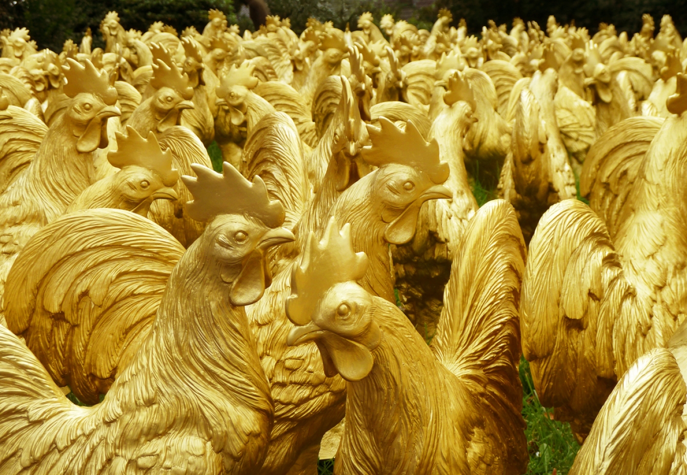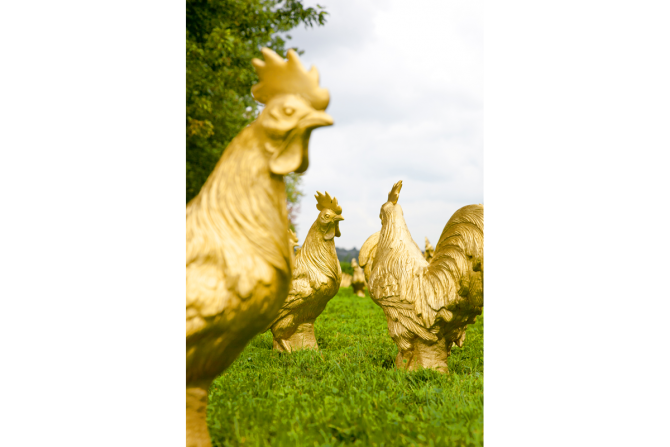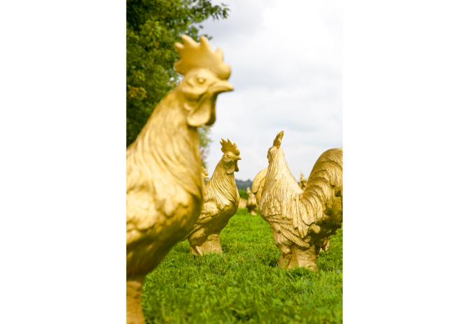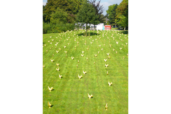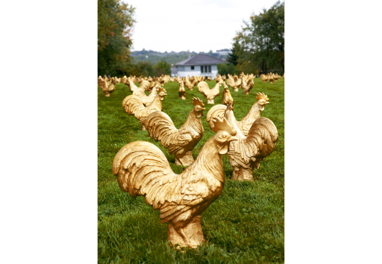 Installation „Homestory“ mit 1.000 goldenen Hähnen auf dem Karl-August-Jung-Platz in der Gartenstadt Haan