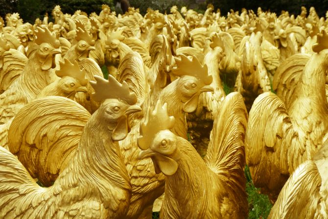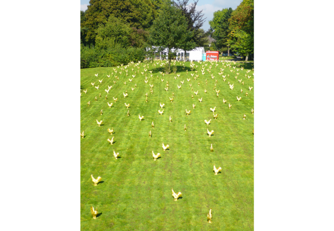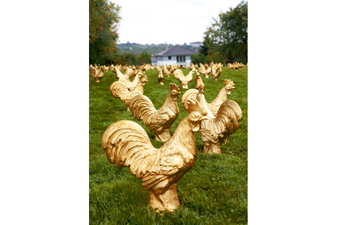 „Ich besetze mit meinen Installationen einen Lebensraum, der bestimmte Funktionen erfüllt und der durch meinen Eingriff eine neue Wahrnehmung des Vertrauten anbietet. Das Bild einer Anordnung von eintausend lebensgroßen goldenen Hähnen auf der grünen Fläche des Karl-August-Jung-Platzes wird sich nachhaltig einprägen.“