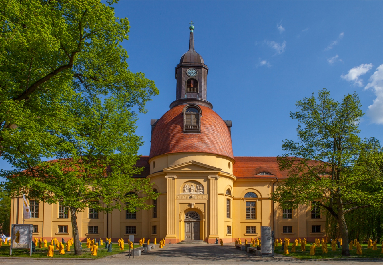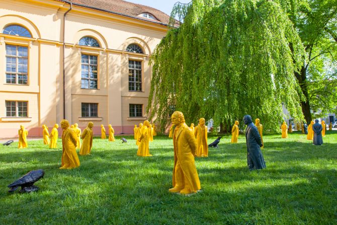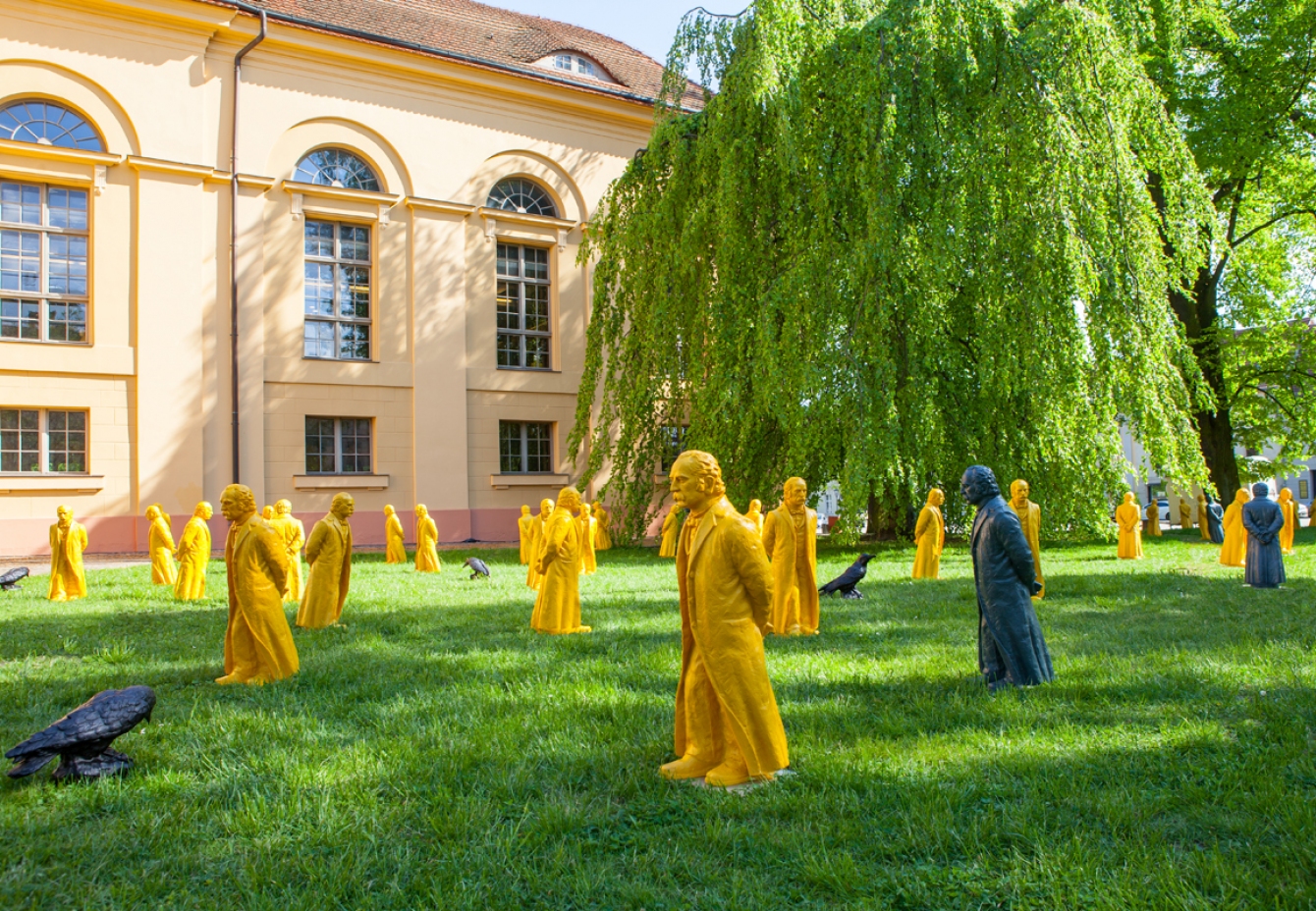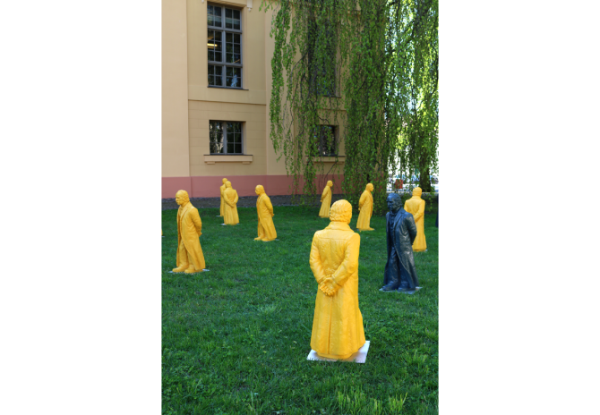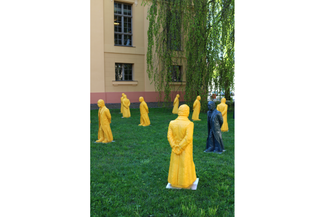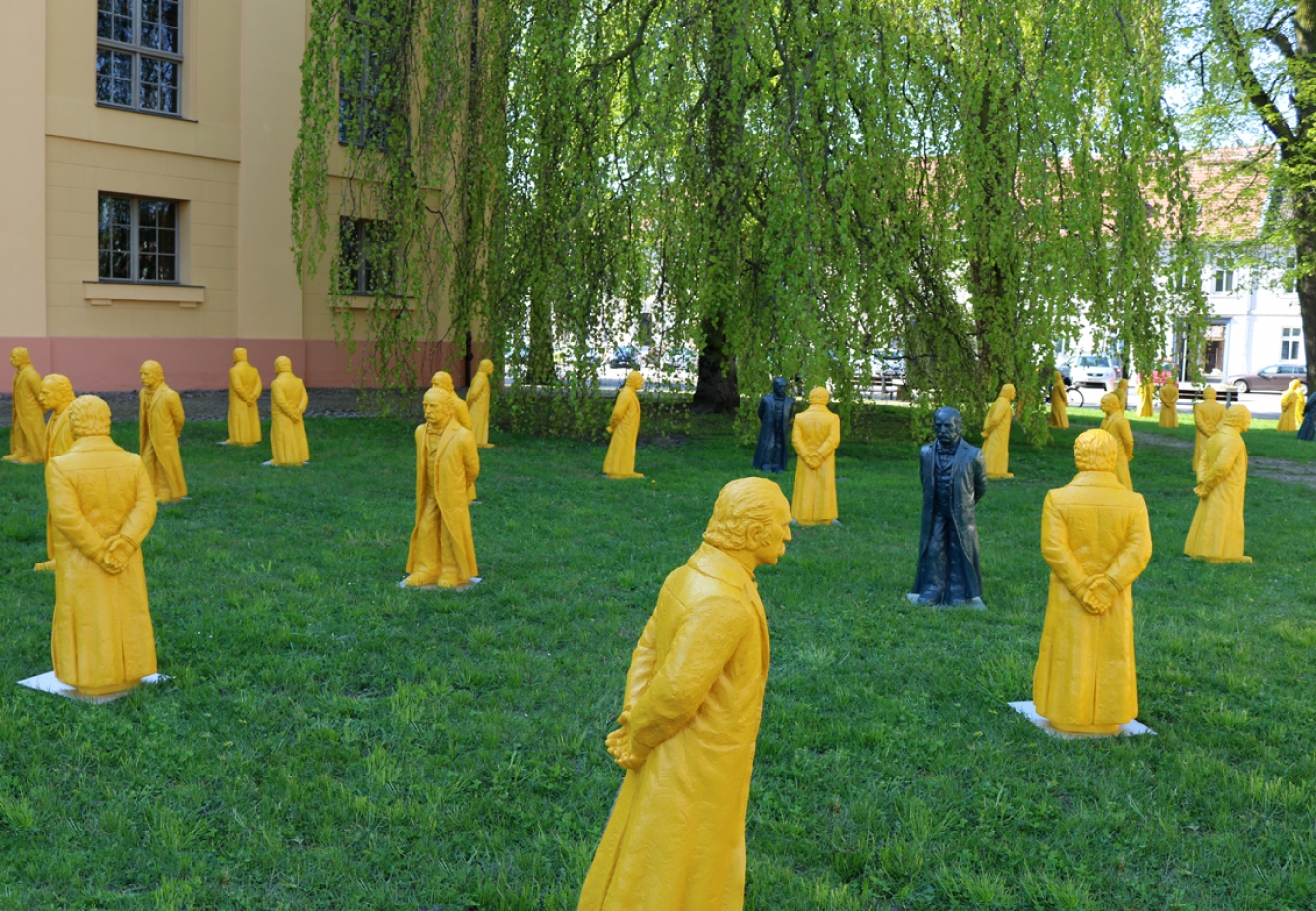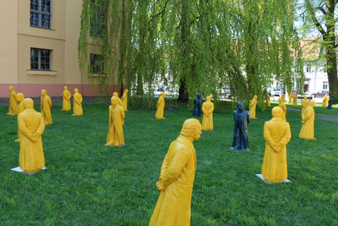 Die temporäre Installation mit 400 gelben und grauen Fontane-Skulpturen aus Kunststoff verwandelt den Vorplatz der Kulturkirche St. Marien in Neuruppin in einen Identität stiftenden, kommunikativen Kunst-Schau-Platz.