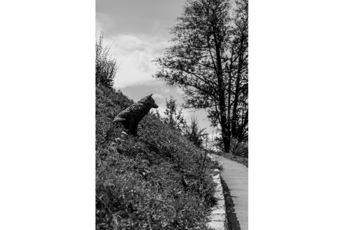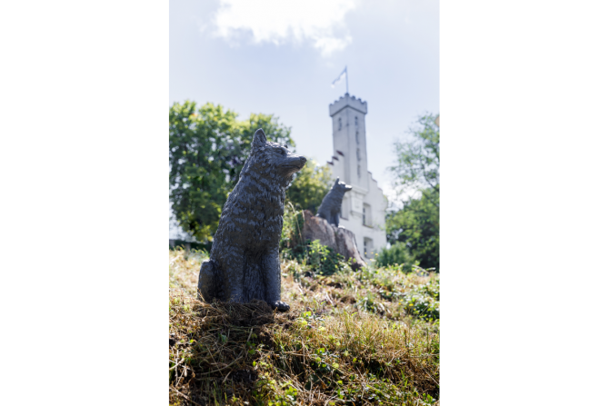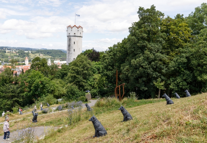 Wie im realen Leben, in dem Wolf und Mensch sich erneut begegnen, sind auch Hörls Kunstwölfe aus dem Schutzraum Museum entlassen, im Freien aufgestellt und damit unseren Reaktion ausgesetzt. Sie als Besucher und Spaziergänger sind eingeladen, das atemberaubende Bild auf sich wirken zu lassen und über die Projektionen des Menschen auf den Wolf zu reflektieren. Denn unsere von der Volkskultur geprägten Vorstellungen vom bösen, gefräßigen und grausamen Wolf sind auch mitgeprägt von eigenen Ängsten und verstellen den Blick auf die reale Lebenssituation des Tieres. (Text: Dr. Nicole Fritz, Direktorin Kunstmuseum Ravensburg)