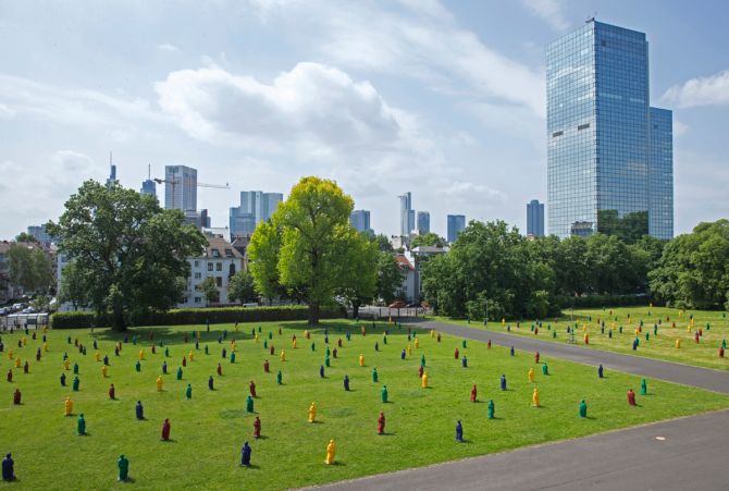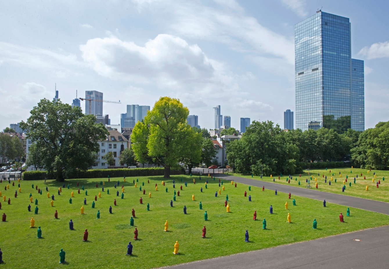 The 2014 jubilee inspires a specific dialogue between Goethe University as "the most important enterprise in Frankfurt" and those who live in the city and the region. To create a link to the "broader public", artist Ottmar Hörl, who also has close ties with the city of Frankfurt, was invited by representatives of the university to make a public installation in front of the building’s main entrance on Campus Westend. In this way, Goethe the personality, Goethe the man, Goethe the promoter of culture, Goethe the scientist, multiplied by more than 400 Goethe sculptures (created in the colours of the historical faculties) will be visible and leave his mark on a large open meadow in front of the IG Farben Building. Seeing and experiencing the sculptural project, will immediately cause beholders to assess the scene while themselves being touched by it, creating a very personal moment of reminiscence.